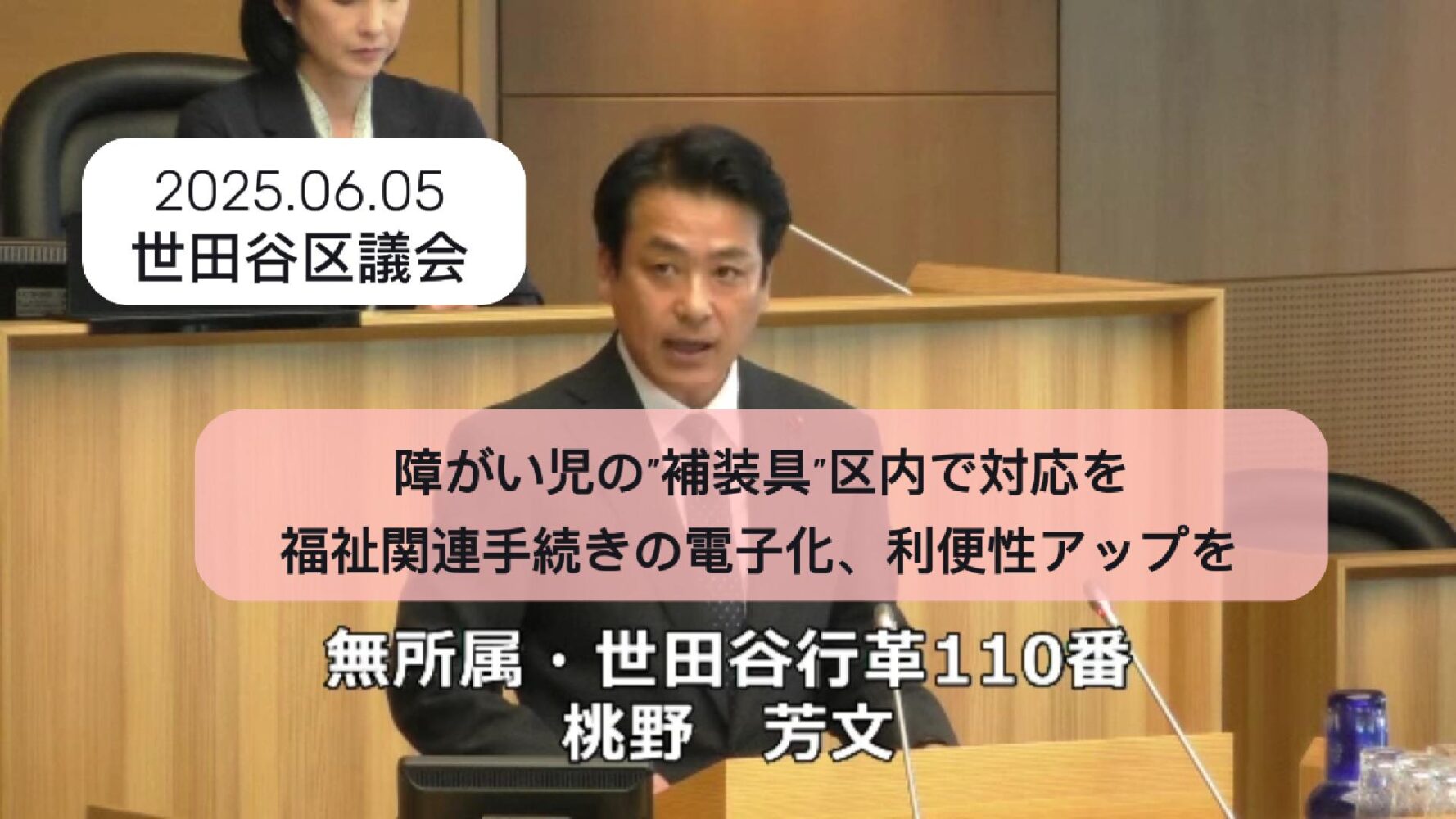世田谷区議会議員、桃野芳文です。 今日のブログも先の区議会一般質問より。 質問と答弁を3分程度の動画にまとめました。以下ご覧ください。 区議会本会議にて、区保健センターの機能整備を訴えました。障がい児、障が … 続きを読む 区の保健センター機能整備で障がい児の補装具対応を。福祉関連手続きの利便性向上を。