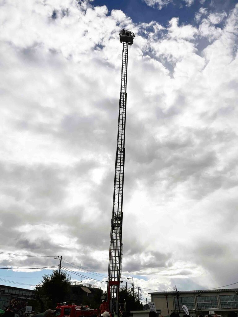 こちらは毎年恒例のはしご車体験。本物のはしご車がやってきて、抽選で選ばれた子どもたちを空高くへご案内。ちなみにはしご車は建物の10階から14階程度まで届く高さがあるようです。子ども達、下からは表情を窺い知ることもできませんが、怖くないのかな。。。