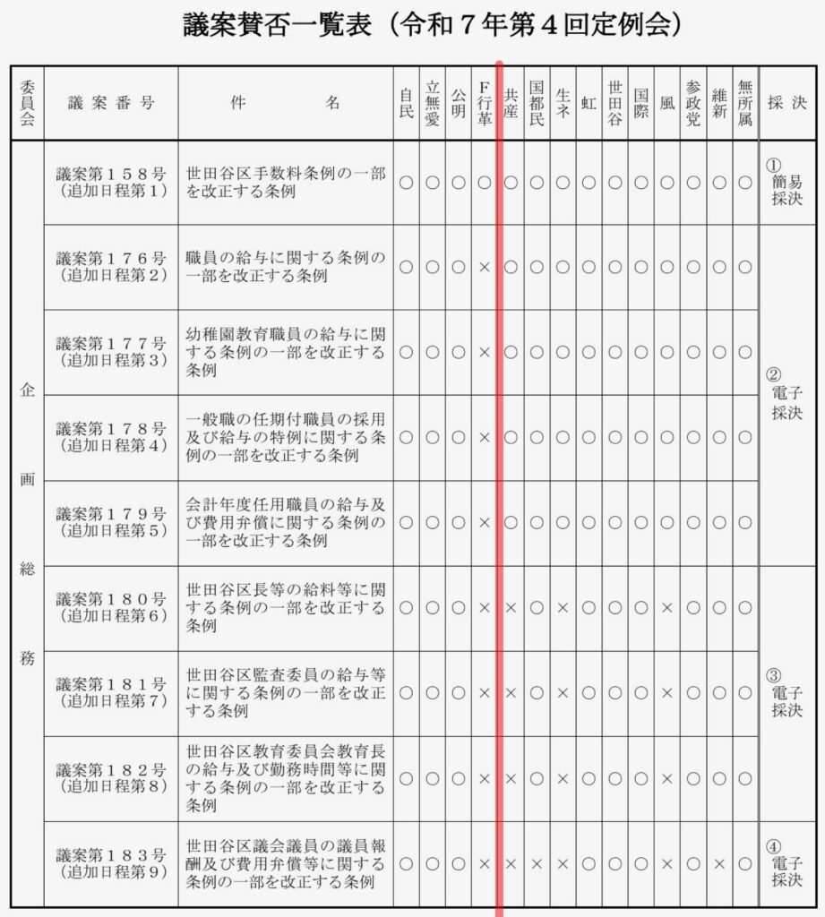 それ以外の8件は、区職員や区長等の給与に関するもので、これはそれぞれ賛否が分かれました。簡単に言うとそれぞれ「給与アップ条例」になります。