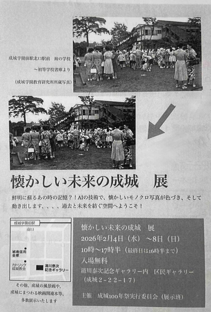 懐かしい未来の成城 展。モノクロ写真の人々が彩り鮮やかに動き出します。
