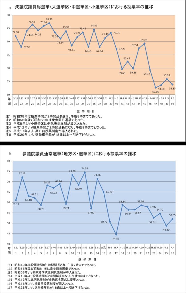 ちなみに国政選挙における投票率の推移を見ると以下の状況。総務省のサイトより転載しました。近年では有権者の半分程度の方しか投票していません。ちなみに前回(令和5年4月)の世田谷区議会議員選挙の投票率は46.11%でした。