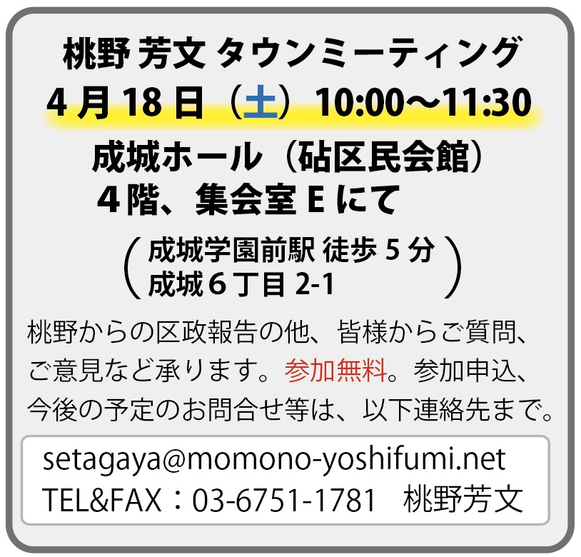 桃野芳文タウンミーティング開催。4/18(土)10時、成城ホール集会室E。