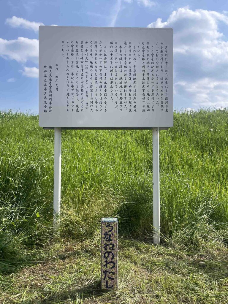 かつて世田谷と川崎の間を流れる多摩川では「宇奈根の渡し」と呼ばれる渡し船が、地元の足、日常の交通手段として使われていました。昭和25年(1950年)ごろまでは実際に使われていたそうです。
